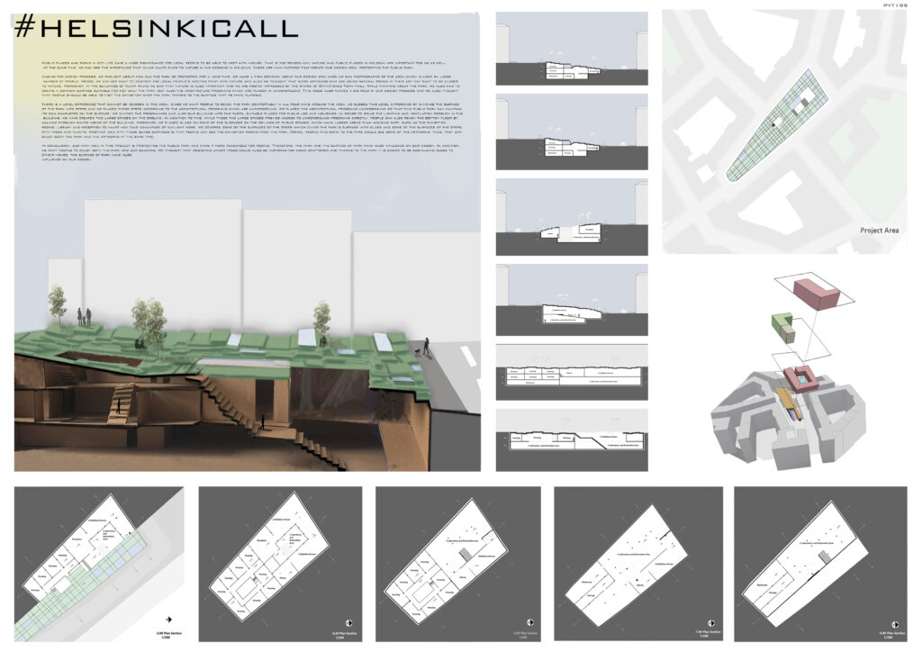 Public places and parks in city life have a huge significance for local people to be able to meet with nature. That is the reason why nature and public places in Helsinki are important for us as well. At the same time, we can see the importance that Alvar Aalto gives to nature in his designs in Helsinki. These are main factors that create our design idea; protecting the public park. During the design process, we thought about how can the park be protected for a long time. We made a firm decision about our design idea when we saw photographs of the area which is used by large number of people. Hence, we did not want to destroy the local people’s meeting point with nature and also we thought that wood artisians who are using natural pieces in their art may want to be closer to nature. Moreover, in the buildings of Alvar Aalto we saw that nature is also important and we are mostly impressed by the stairs of Säynätsalo Town Hall. While thinking about the park, we also had to create a common surface suitable for not only the park, but also the architecture programs which are placed in underground. This issue also played a big role in our design process and we also thought that people should be able to visit the exhibition over the park thanks to the surface that we have planned. There is a level difference that cannot be ignored in the area. Since we want people to reach the park comfortably in all four ways around the area, we closed this level difference by dividing the surface of the park into steps and we placed these steps according to the architectural programs which are underground. We placed the architectural programs underground so that this public park can maintain its own character on the surface. We divided the programmes and also our building into two parts, suitable places for public use and housings. In order to solve the lighting and ventilation problem in the building, we have created two large spaces on the ground. In addition to this, while these two large spaces provide access to underground programs directly, people can also reach the bottom floor by walking through ramps inside of the building. Moreover, we placed glass on some of the surfaces on the ceilings of public spaces, which have larger areas than housing part, such as the exhibition rooms, library and reception to maket hem take advantage of daylight more. We covered some of the surfaces of the steps -which divide the park’s surface- with glass and some of the surfaces of the steps with trees and plants. Another idea with these glass surfaces is that people can see the exhibition rooms from the park. Hence, people who come to the park could see some of the artworks; thus, they can enjoy both the park and the artworks at the same time. In conclusion, our main idea in this project is protecting the public park and make it more reachable for people. Therefore, the park and the surface of park have huge influence on our design. In addition, we want people to enjoy both the park and our building. We thought that designing under trees could also be inspiring for wood craftsmen and thanks to the park it is easier to be socializing close to ztheir homes. the surface of park have huge influence on our design.