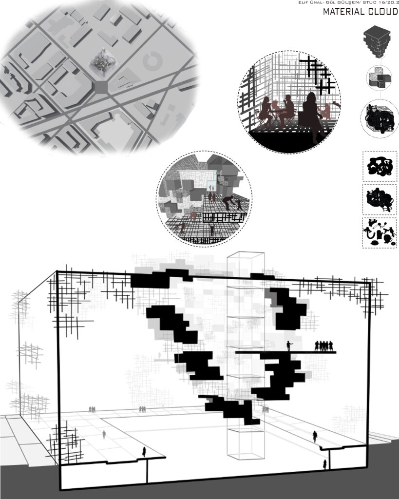 We used glass on the outer perimeter of the building to become an exhibition element. Inside, the metal structure, which is the carrier of the building, forms the exhibition element by bending. By attaching different materials, items and objects produced in the workshop on this structure, a self-knitting space emerges and the user is contacted. This mass, which forms permanent and temporary exhibition halls, is experienced with platforms where we place the cloud of material in different directions and heights. In addition, the structure of the building swells in some places, creating other places such as cafe shop information. Our other programs are underground. The ceiling tiles of the programs that we divide into fractures to solve the light and air problem also create a floor to watch the exhibition hall.